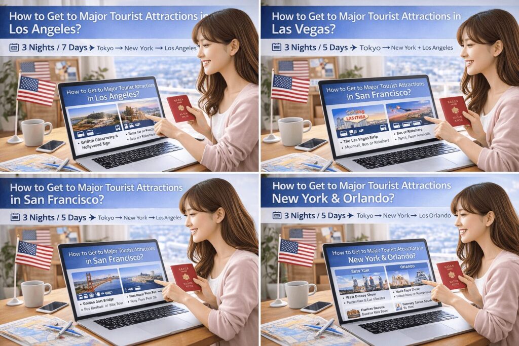 • ロサンゼルス3泊+ラスベガス2泊:西海岸の定番コース。都市間はフライトまたは長距離バスで約4〜5時間。