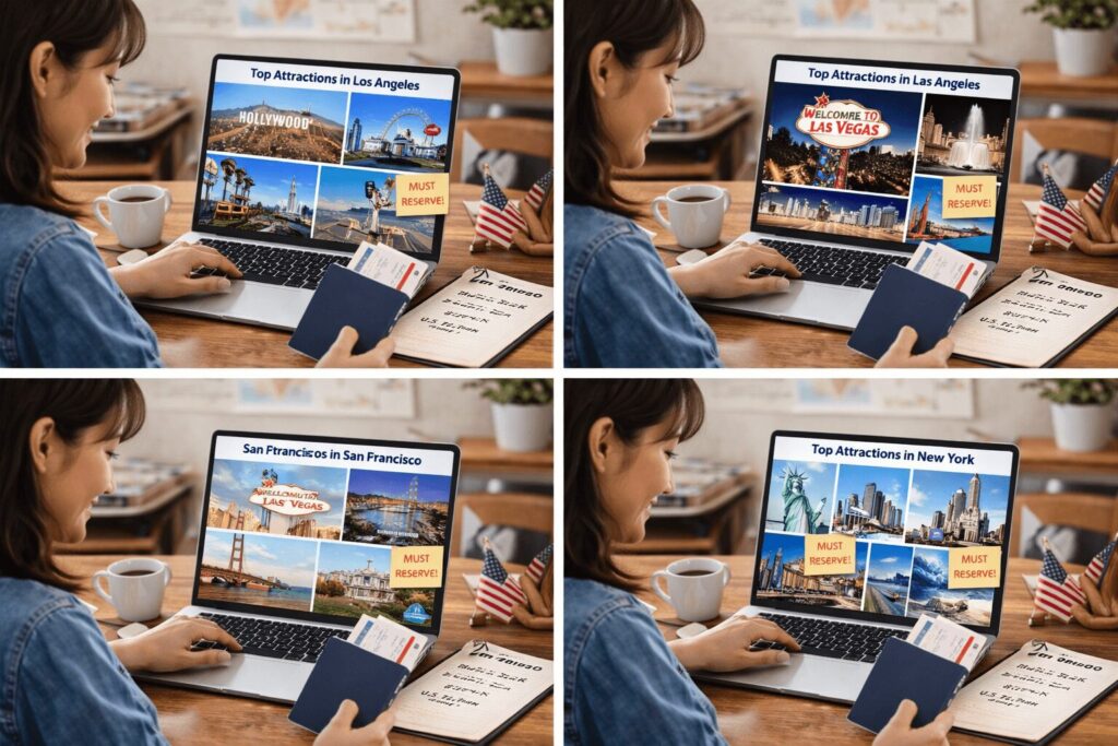 • ラスベガス:主要ホテルとカジノ、ショー観賞が1〜2日で体験できる。グランドキャニオン日帰りツアーも人気。