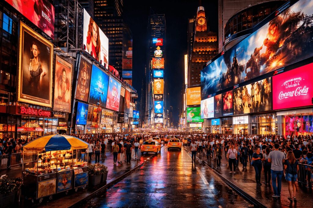 まずは夜のタイムズスクエアで巨大なLEDビルボードが輝く圧巻の光景を楽しんでください。