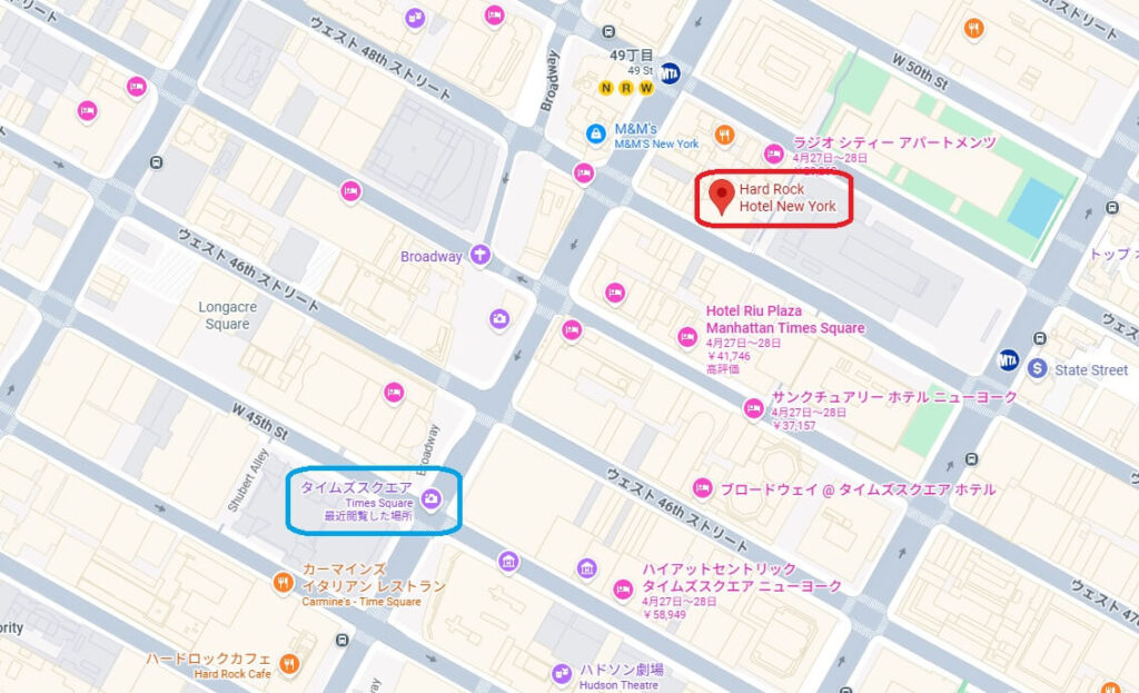 - タイムズスクエアまでの距離で選ぶなら、カサブランカ(1分)、テンポ バイ ヒルトン(2分)、ハード ロック(2分)、メリオン ロウ(2分)の4軒が最短距離で特におすすめ。