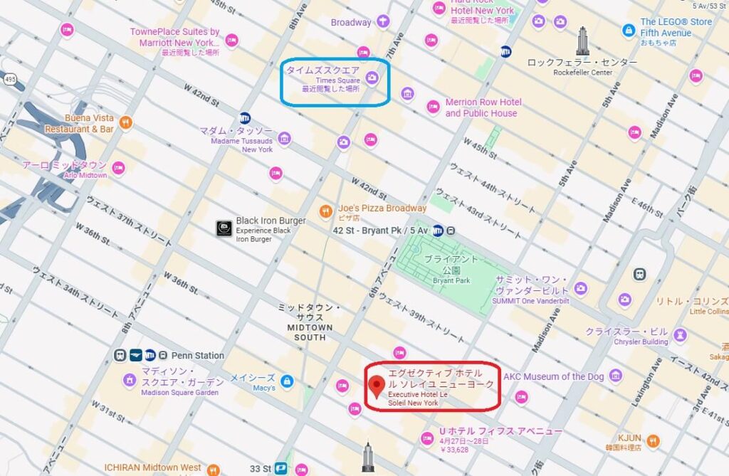 - 周辺環境:タイムズスクエア・ブロードウェイが徒歩1分。エンパイアステートビル、ロックフェラーセンター、5番街、ブライアントパークもすべて徒歩15分以内